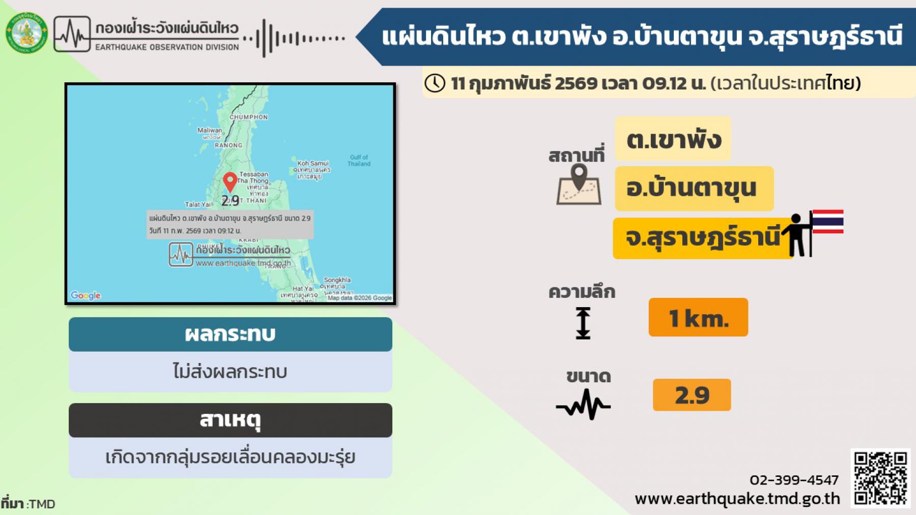 2.9 | 9.044°N | 98.738°E | 1 | ต.เขาพัง อ.บ้านตาขุน จ.สุราษฎร์ธานี Tambon Khao Phang, Amphoe BanTaKhun, SuratThani |