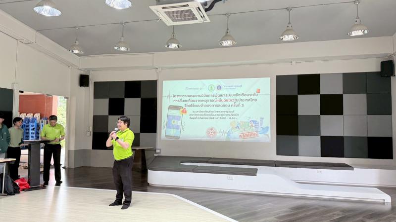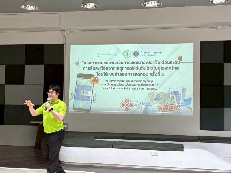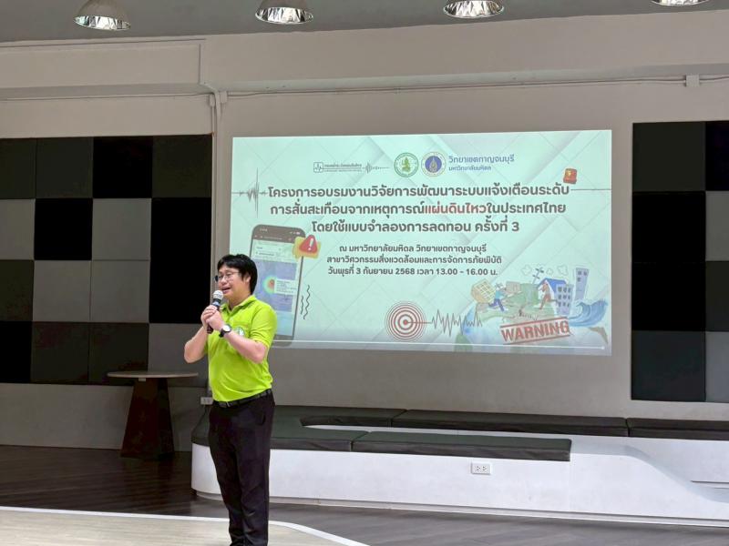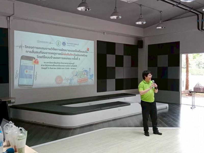 วันที่ 3 กันยายน 2568 กองเฝ้าระวังแผ่นดินไหวจัดกิจกรรม โครงการอบรมงานวิจัยการพัฒนาระบบแจ้งเตือนระดับการสั่นสะเทือนจากเหตุการณ์แผ่นดินไหวในประเทศไทย โดยใช้แบบจำลองการลดทอน ครั้งที่ 3 ณ มหาวิทยาลัยมหิดล วิทยาเขตกาญจนบุรี ซึ่งเป็นส่วนหนึ่งของโครงการวิจัยที่ได้รับเงินอุดหนุนจากกองทุนส่งเสริมวิทยาศาสตร์ วิจัย และนวัตกรรม ประจำปีงบประมาณ พ.ศ. 2568 โดยในกิจกรรมนี้ได้มีการเผยแพร่การใช้งานระบบแจ้งเตือนระดับการสั่นสะเทือน ที่ได้พัฒนาขึ้นจากโครงการวิจัยนี้ ให้กับนักศึกษาและอาจารย์ จากมหาวิทยาลัยมหิดล ที่เข้าร่วมกิจกรรมทั้งสิ้นจำนวน 70 คน